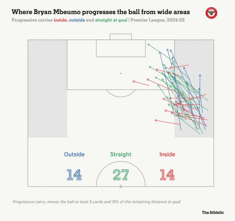 观察姆贝莫上赛季跑动可见,他偏爱在左肋部觅食。若得时间和空间,他惯于带球杀入禁区后左脚内切射门。若此路不通,26岁的他也能凭速度外线超车传中。