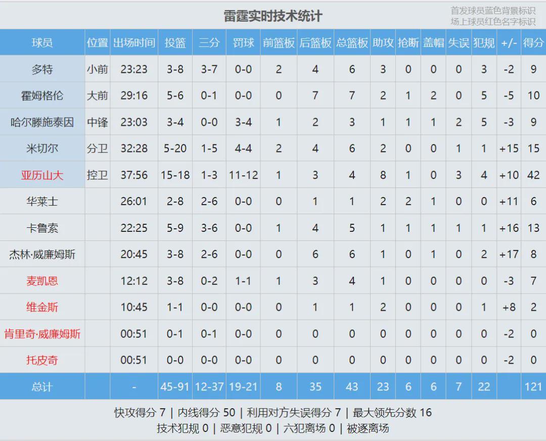 亚历山大接管比赛,此役投篮18中15,三分3中1,罚球12中11,狂轰42分4篮板8助攻1抢断,得分创个人季后赛生涯新高。其中有6个罚球,来自太阳最后的犯规战术。今年季后赛首轮前三场已经全部结束,仅雷霆和湖人取得3-0领先。
